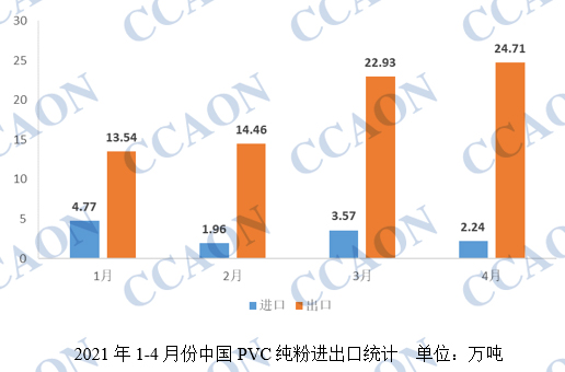 2021年1-4月,我国累计进口PVC纯粉量12.55万吨,较去年同期下降32.9%,1-4月份,国内累计出口PVC纯粉75.64万吨,与去年同期相比大幅增加293.3%,现已超出2020年全年累计出口量。
