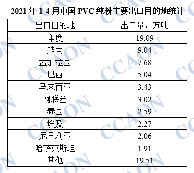 从出口目的地统计,由于本国装置开工不稳以及美国货源短缺,印度对中国PVC纯粉的需求量维持在高位。2021年1-4月份,中国出口至印度的PVC纯粉达19.09万吨,占中国出口总量的25.2%。但随着印度新冠肺炎疫情的反复,以及美国寒潮影响的逐渐消退,印度对中国PVC纯粉的依赖度将有所降低。