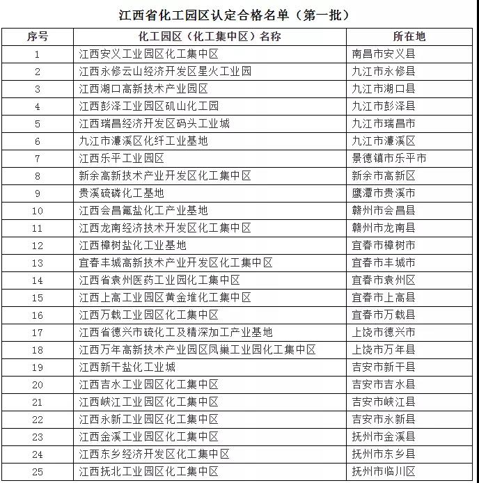 3月16日,江西省工业和信息化厅网站公示了江西省化工园区认定合格名单(第一批),共有25家园区入围。 根据名单,九江市和宜春市各有5家,吉安市有4家,抚州市有3家,上饶市和赣州均为2家,南昌、景德镇、新余和鹰潭市各有1家。