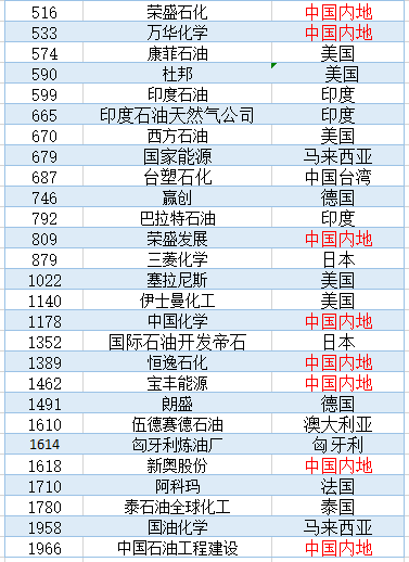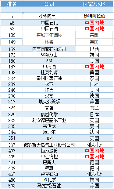 中国石油和化工企业共有14家上榜,分别是:中国石油、中国石化、中海油、恒力股份、中远海控、台塑石化、万华化学、新奥股份、荣盛发展、中国化学、荣盛石化、恒逸石化、中国石油工程建设、宝丰能源。