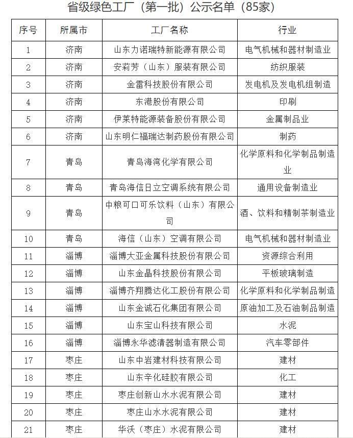 山东省近日公示省级绿色工厂名单