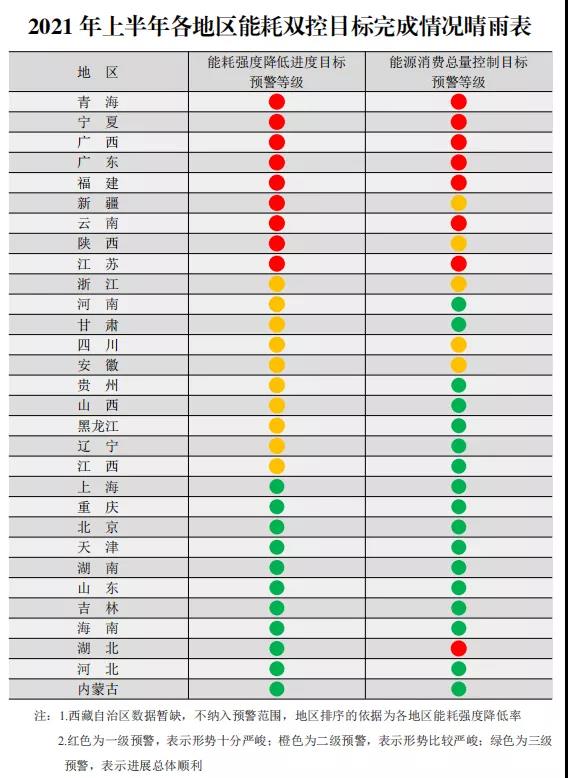 根据发改委印发《2021年上半年各地区能耗双控目标完成情况晴雨表》可知,广东、福建、云南、江苏、浙江、安徽、四川等12个地区在能耗降低和能源消费总量方面均呈现严峻态势,这意味着有一半以上的省份上半年“双控”目标未能完成。