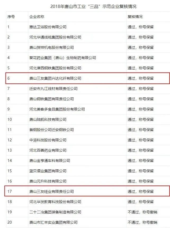 近期,唐山市工业和信息化局对2021年唐山市工业“三品”示范企业,2018年认定的“三品”示范企业复核结果进行公示,三友集团兴达化纤有限公司、三友集团硅业有限责任公司顺利通过唐山市工业“三品”示范企业复核,并继续保留工业“三品”示范企业称号。近年来,三友集团持续推进工业企业增品种、提品质、创品牌“三品”活动,为提升唐山市工业企业发展水平,加快推动工业经济高质量发展做出了积极贡献。