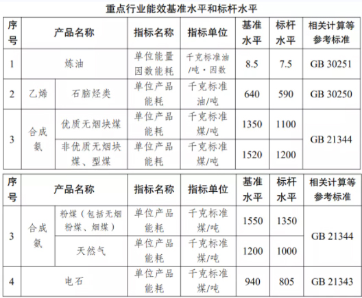 (七)修订完善产业政策标准。对照行业能效基准水平和标 杆水平,适时修订《炼油单位产品能源消耗限额》《乙烯装置单 位产品能源消耗限额》《合成氨单位产品能源消耗限额》《电石 单位产品能源消耗限额》。结合炼油、乙烯、合成氨、电石行业 节能降碳行动以及修订的国家能耗限额标准、污染物排放水平, 修订《产业结构调整指导目录》《绿色技术推广目录》。