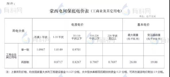 内蒙古发改委提出《关于明确蒙西地区电力市场交易用户保底电价的通知》中的保底电价比原有电价上浮了80%。蒙西的新保底电价如下表所示:蒙西的原销售电价: