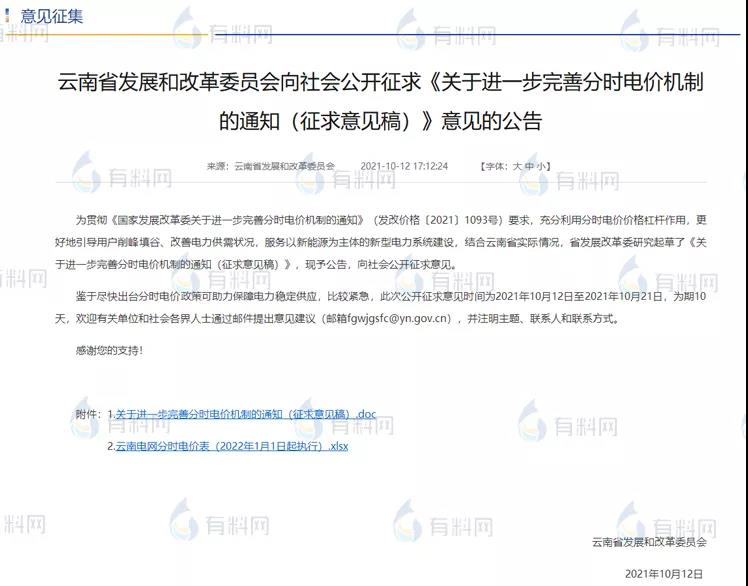 云南发改委发布公告《关于进一步完善分时电价机制的通知(征求意见稿)》。电度电价峰谷价差维持现行1.5:1:0.5,其中非市场化电量在目录丰枯电价基础上,峰时段电价在平时段基础上上浮50%,谷时段在平时段电价下浮50%;市场交易电量以当月电能量交易价格为基准,峰时段电价上浮50%,谷时段电价下浮50%。