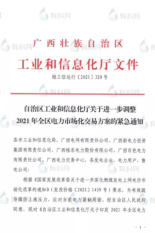 广西发布《自治区工业和信息化厅关于进一步调整2021年全区电力市场化交易方案的紧急通知》,在紧急通知中,高耗能企业电价直接上浮50%进行结算。左右滑动查看更多