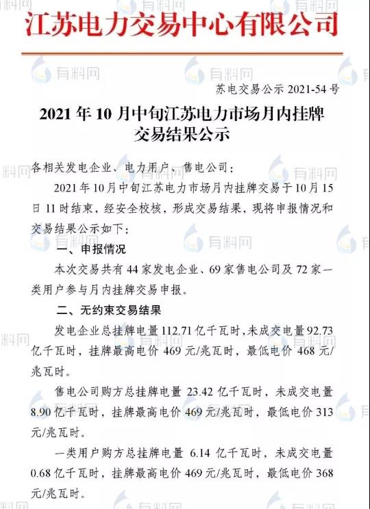 江苏组织开展了10月中旬月内挂牌交易,共成交电量19.98亿千瓦时,成交均价468.97元/兆瓦时,成交价较基准价上浮了19.94%。