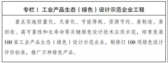 (四)推行工业产品绿色设计。健全工业产品绿色设计推行机制。引导企业改进和优化产品和包装物的设计方案,减少产品和包装物在整个生命周期对环境的影响。在生态环境影响大、产品涉及面广、行业关联度高的行业,创建工业产品生态(绿色)设计示范企业,探索行业绿色设计路径。健全绿色设计评价标准体系。鼓励行业协会发布产品绿色设计指南,推广绿色设计案例。