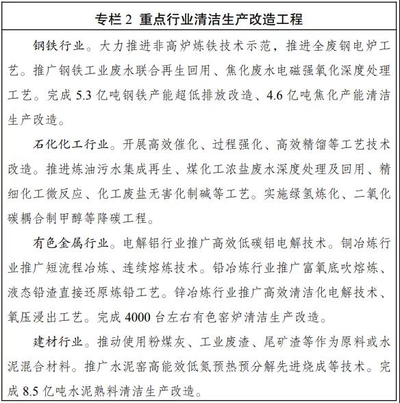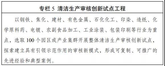 (六)大力推进重点行业清洁低碳改造。严格执行质量、环保、能耗、安全等法律法规标准,加快淘汰落后产能。全面开展清洁生产审核和评价认证,推动能源、钢铁、焦化、建材、有色金属、石化化工、印染、造纸、化学原料药、电镀、农副食品加工、工业涂装、包装印刷等重点行业“一行一策”绿色转型升级,加快存量企业及园区实施节能、节水、节材、减污、降碳等系统性清洁生产改造。在国家统一规划的前提下,支持有条件的重点行业二氧化碳排放率先达峰。在钢铁、焦化、建材、有色金属、石化化工等行业选择100家企业实施清洁生产改造工程建设,推动一批重点企业达到国际清洁生产领先水平。