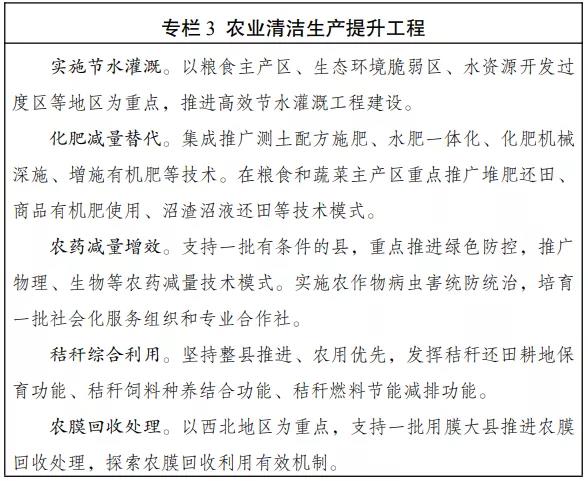 (八)提升农业生产过程清洁化水平。改进农业生产技术,形成高效、清洁的农业生产模式。严格灌溉取水计划管理,大力发展旱作农业,全面推广节水技术,不断提高农业用水效率。深化测土配方施肥,推广水稻侧深施肥等高效施肥方式。全面推广健康养殖技术,推动兽用抗菌药使用减量。加快构建种植业、畜禽养殖业、水产养殖业清洁生产技术体系,大力推广种养加一体化发展模式。
