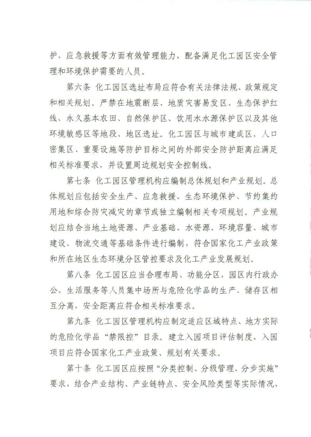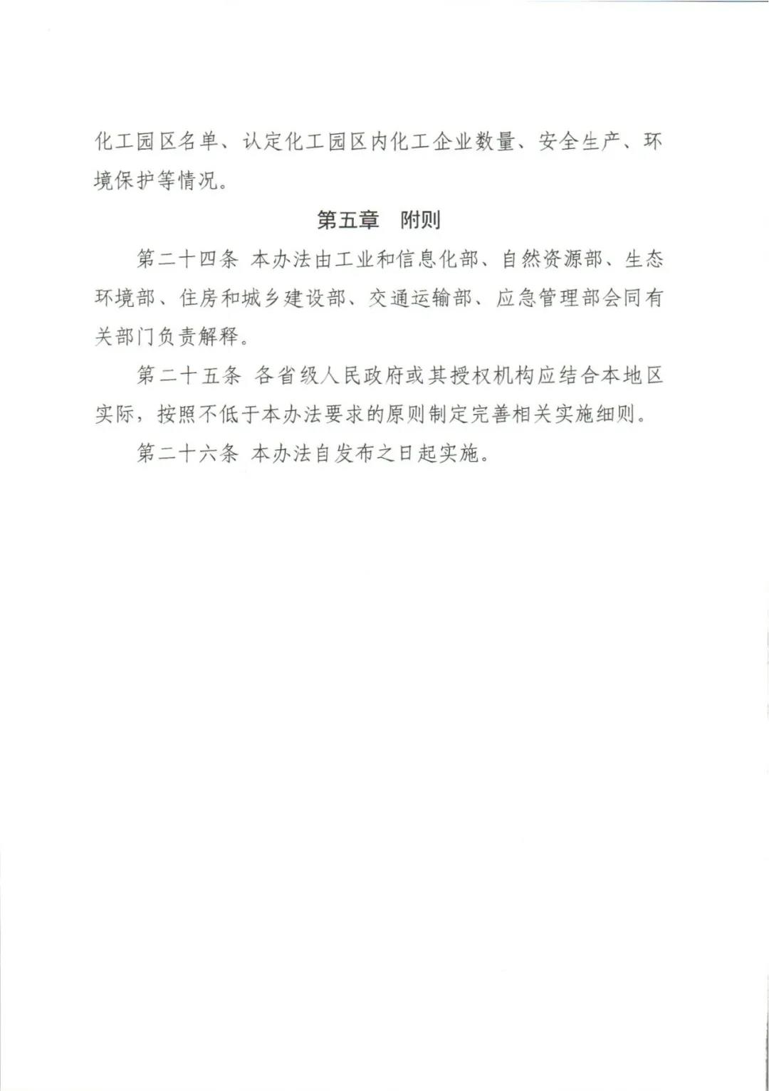 为规范化工与园区建设和认定管理,提升化工园区安全发展和绿色发展水平,工业和信息化部、自然资源部、生态环境部、住房和城乡建设部、交通运输部、应急管理部等六部门近日联合印发《化工园区建设标准和认定管理办法(试行)》。《管理办法》共5章26条,自发布之日起实施。