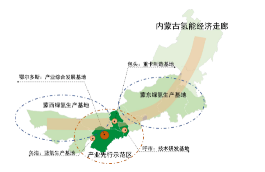 六个基地:充分发挥自治区可再生能源资源优势,打造鄂尔多斯为全国最大的绿氢生产输出基地和全国最大燃料电池重卡应用基地;呼和浩特打造自治区氢能技术研发基地;包头打造自治区燃料电池重卡生产基地;乌海打造自治区工业副产氢生产基地;乌兰察布、巴彦淖尔、阿拉善共同打造蒙西氢能综合生产基地;通辽、赤峰、锡林郭勒共同打造蒙东氢能综合生产基地。