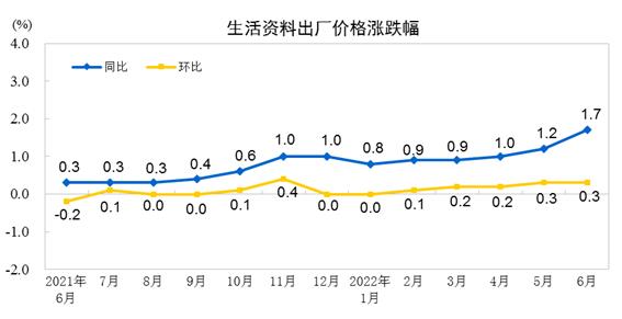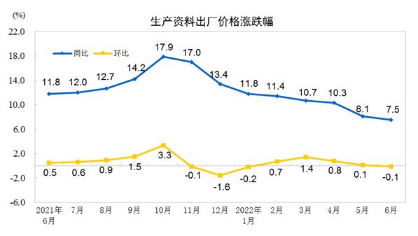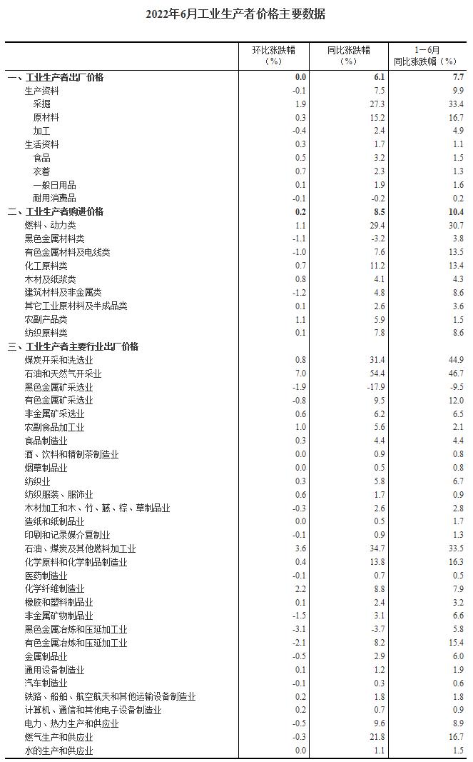 2022年6月份,全国工业生产者出厂价格同比上涨6.1%,环比持平;工业生产者购进价格同比上涨8.5%,环比上涨0.2%。上半年,工业生产者出厂价格比去年同期上涨7.7%,工业生产者购进价格上涨10.4%。