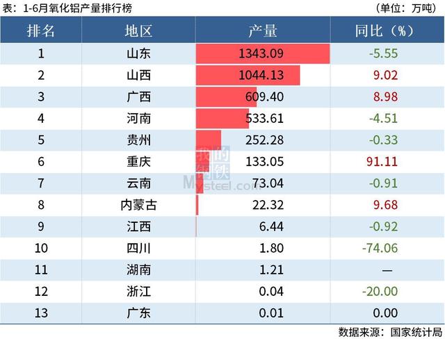 国家统计局数据显示,2022年6月全国氧化铝产量731.7万吨,同比增长7.4%;1-6月累计产量4020.4万吨,同比增长2.3%。其中,上半年山东氧化铝产量同比下降5.55%,山西和广西氧化铝产量分别同比增长9.02%和8.98%。