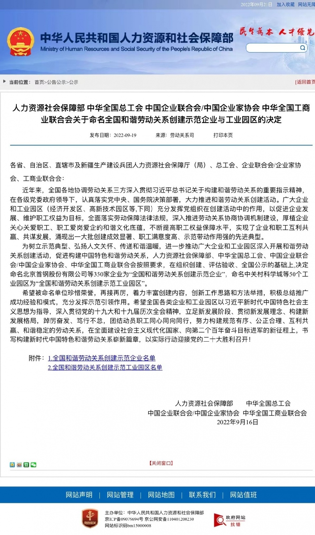 日前,人力资源社会保障部、中华全国总工会、中国企业联合会/中国企业家协会、中华全国工商业联合会联合发布《全国和谐劳动关系创建示范企业名单》,乳源东阳光榜上有名。