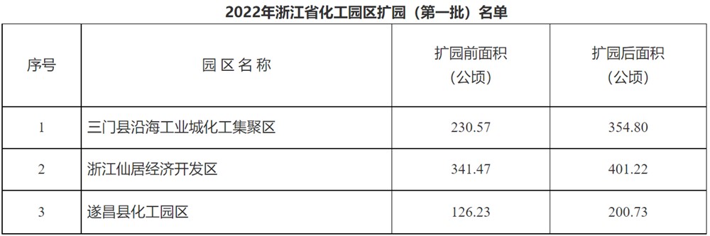 据悉,六部门组织开展了化工园区复核和扩园工作。经认定,三门县沿海工业城化工集聚区、浙江仙居经济开发区、遂昌县化工园区等3家园区符合化工园区扩园要求。