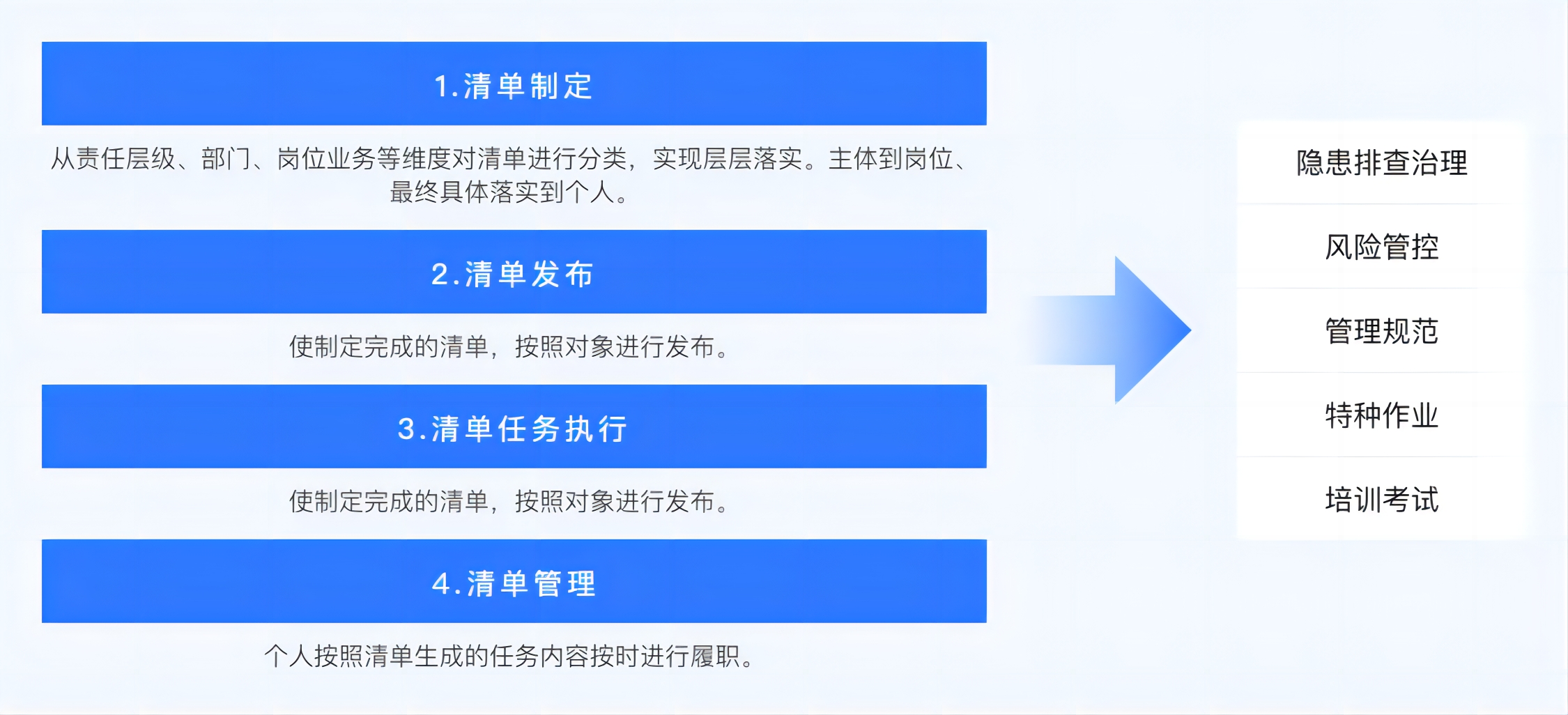 安全责任清单管理——将工作落实到每个人,岗位责任,日常任务形成清单,防止疏忽、提高组织运行效率。