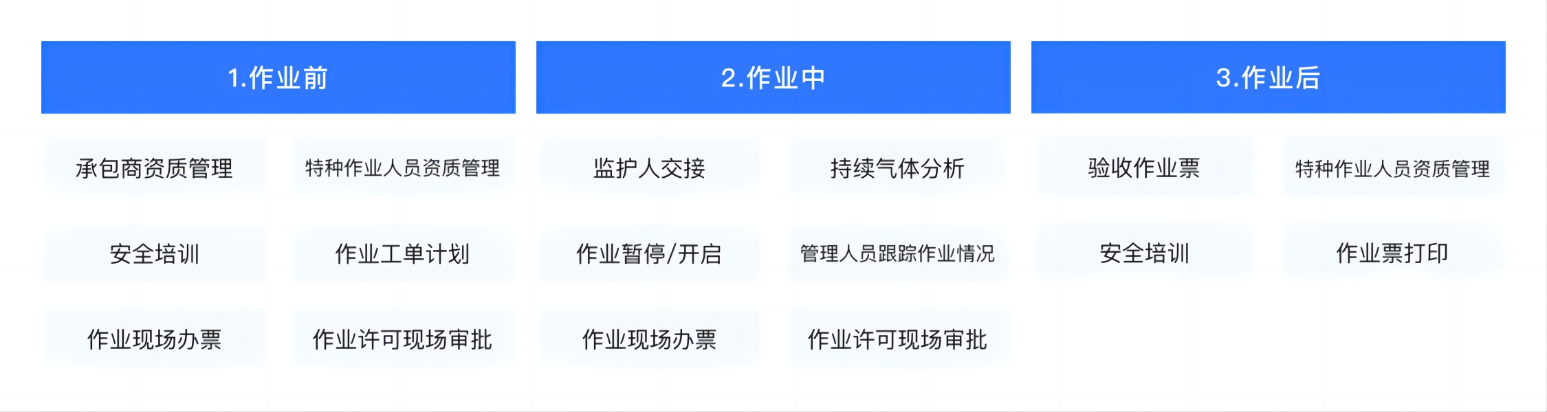 作业安全管理系统的设计充分参考《GB30871-2022化学品生产单位特殊作业安全规范》,通过将动火作业等八大特殊作业的审批许可条件条目化、电子化、流程化,实现对作业全程进行过程和痕迹管理;