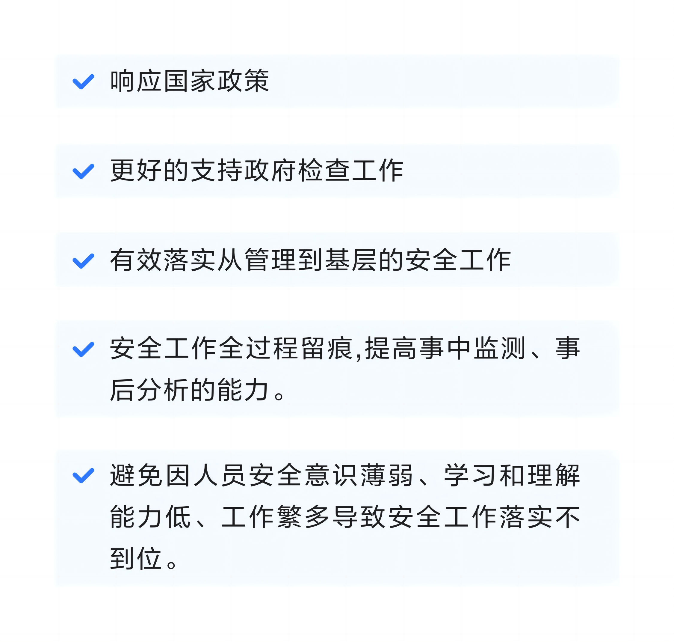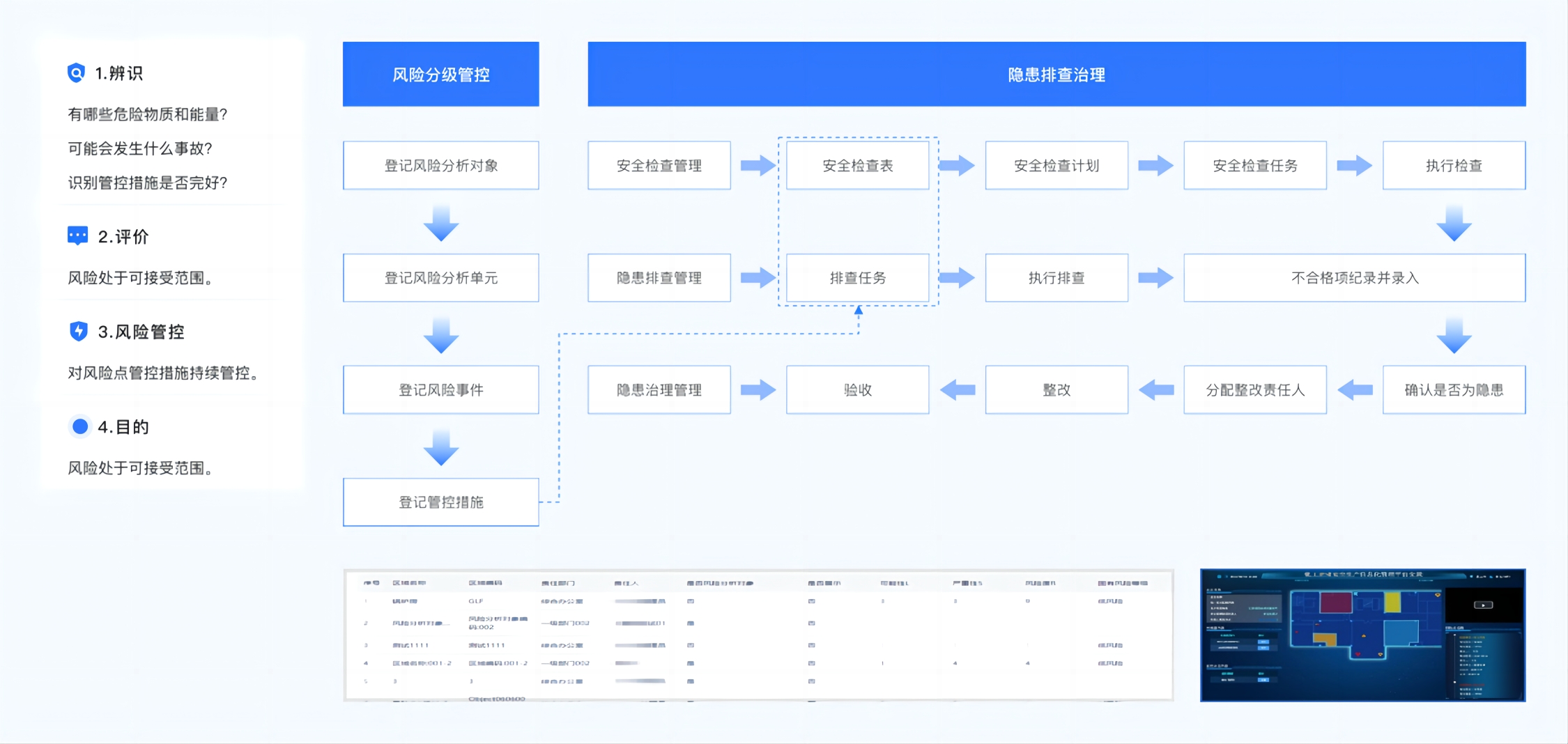 基于风险分级管控和隐患排查治理双体系,建立企业风险分级管控清单,隐患排查清单,通过智能化巡检,构建企业从风险识别到隐患排查治理的闭环管理,压实岗位职责,有效管控重特大风险,预防事故发生。
