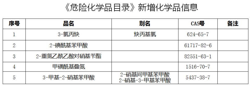1月21日,应急管理部公开征求意见,拟将3-氯丙炔、2-碘酰基苯甲酸、2-重氮乙酰乙酸对硝基苄酯、甲磺酰基叠氮、3-甲基-2-硝基苯甲酸等5种化学品纳入《危险化学品目录》。应急管理部将配套补充完善《危险化学品分类信息表》。