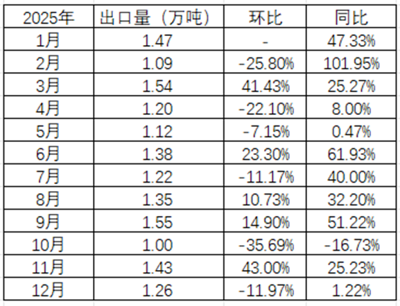 海关统计数据显示,2025年我国电石累计出口量为15.61万吨,与去年12.35万吨相比增加26.41%。每月出口数据如下: