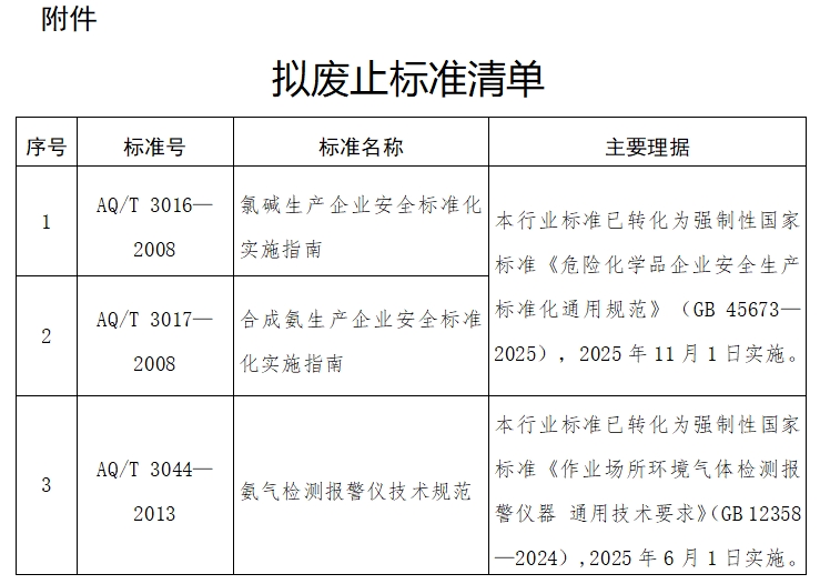 按照《中华人民共和国标准化法》《行业标准管理办法》《应急管理标准化工作管理办法》等有关规定,拟按程序废止《氨气检测报警仪技术规范》等3项安全生产行业标准(详见附件),现予以公示,公示截至2025年12月25日。