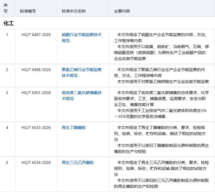 根据行业标准制修订计划,相关标准化技术组织已完成《硫酸行业节能监察技术规范》等5项化工行业标准、《人工智能 赋能应用 废钢智能判级系统技术要求》等10项黑色冶金行业标准、《钴冶炼企业废水循环利用技术规范》等6项有色金属行业标准、《耐碱玻璃纤维无捻粗纱》等23项建材行业标准、《热处理行业节能诊断技术导则》等197项机械行业标准、《船舶建造企业分段制造、装配场地安全管理要求》等2项船舶行业标准的编制工作。为进一步听取社会各界意见,现予以公示。