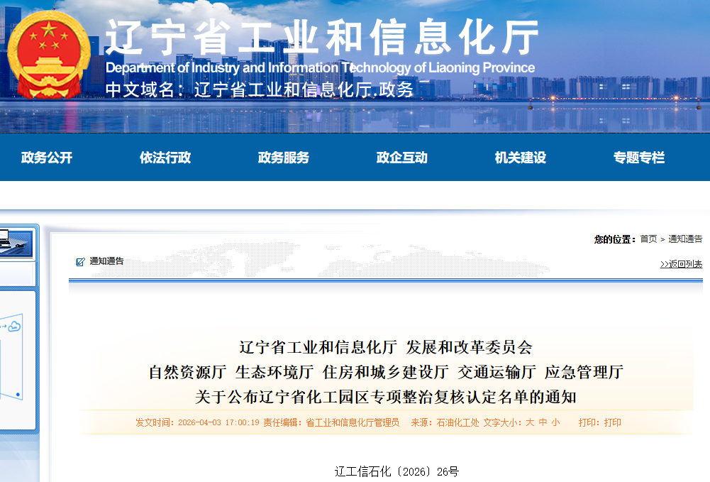 近日,辽宁省工业和信息化厅、辽宁省发展和改革委员会、辽宁省自然资源厅等七部门联合发布通知,公布全省化工园区专项整治复核认定名单。